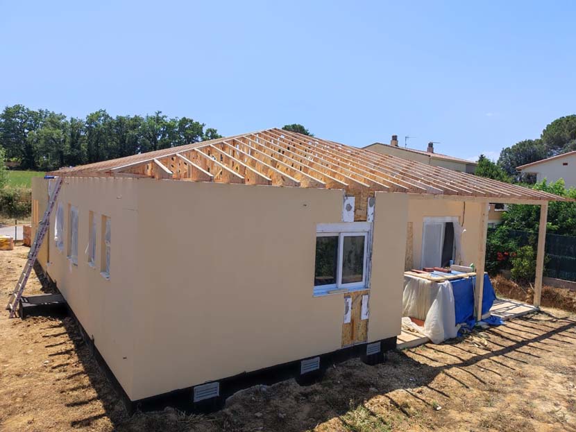 Una de las características destacadas de esta casa es que la cubierta fue montada in situ, debido a las limitaciones de altura que presenta el transporte de viviendas modulares.